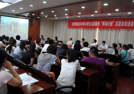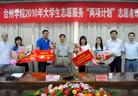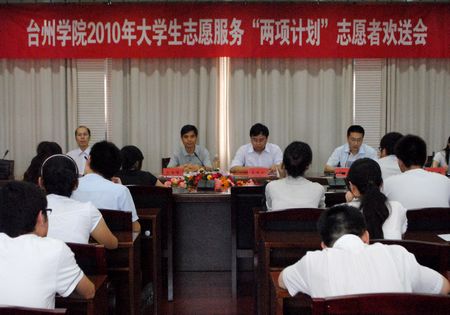 6月22日下午,2010年大学生志愿服务西部计划和大学生志愿服务我省欠发达地区计划志愿者欢送会在校第一会议室举行。来自人文学院的方岑颖、刘占同学当选我校大学生志愿服务西部志愿者,来自艺术学院的都星炜同学当选大学生志愿服务我省欠发达地区志愿者,即将踏上志愿服务岗位。校党委副书记包国强出席欢送会并讲话。