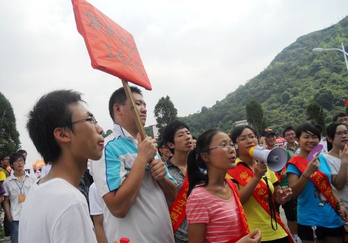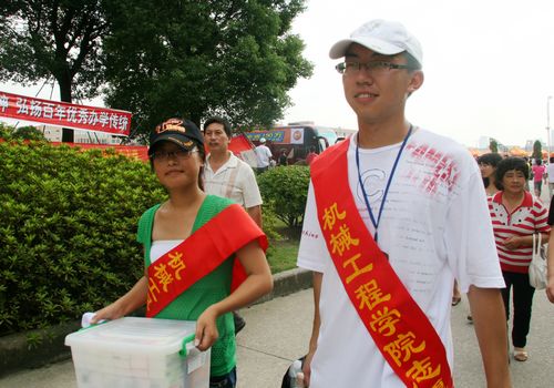 “机械工程学院的在这里!”“经贸的这边,国贸、财管、市营的这边走!”“有没有医学院的?有没有医学院的?”校车一抵达椒江校区,一群挂着各学院红色绶带的志愿者们就一哄而上,手拿喇叭大声叫嚷,争抢着各自的“生源”,好似担心一不留神学弟学妹们就会溜走。