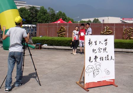 本次活动主要是为新生及新生家长免费拍照留念。志愿者们把“摄影点”设置好后,吸引了不少新生及家长前来光顾。一位与父母一起留影的学生表示,“我们是来自东北的,乘了好几天的火车才到这里,能在这里留影感觉很有纪念意义。”