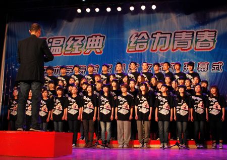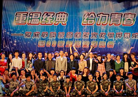 “重温经典,给力青春” 艺术学院首届创艺文化节开幕式暨09级音乐班专场晚会5月3日晚在校影剧院顺利举办。校长龚建立、学工部部长周全宝、校团委书记王凌、学工部副部长张梅芬、艺术学院党总支书记金灵秋、艺术学院副院长罗永良等出席开幕式并观看了晚会。艺术学院党总支副书记杨华鹏致开幕词。