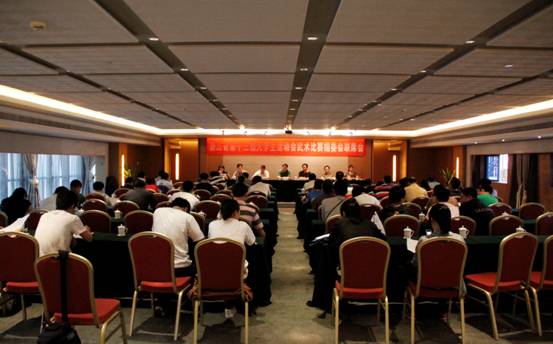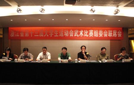 6月3日下午,浙江省第十三届大运会武术比赛组委会联席会在台州国贸大饭店东湖厅召开。省教育厅体卫艺处调研员、大学生体协秘书长徐剑津,省大学生体协武术分会副主席兼秘书长骆红斌,省大学生体协武术分会副主席张华达、季建成,浙江大学教育学院体育系主任、国际级裁判、本届武术比赛总裁判长林小美教授,台州学院体育科学学院院长方爱莲教授出席会议;省大学生体协副秘书长、武术分会主席苏亚平教授主持会议。各参赛高校代表队领队、教练员和本次比赛全体裁判员参加会议。