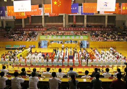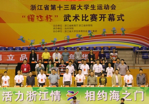 继健美操比赛6月1日美丽谢幕后,由我校承办的浙江省第十三届大学生运动会“耀江杯”武术比赛4日上午在东湖体育馆隆重开幕。来自全省25所高校的243名大学生武林高手相聚古城临海,展开棍、枪、刀、剑及南拳、长拳、太极拳、短器械等共20余个武术项目的角逐。
