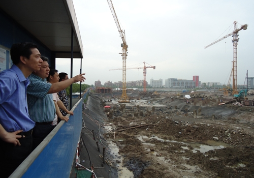 陈浩书记一行来到建设工地,首先听取了台州耀江房产开发有限公司总经理郑先金关于工程进度情况的汇报。目前,“学府家园”小高层标段的桩基工程已全部完工,开始进入地下室的基础施工阶段;多层标段已完成大部分的桩基工程,其中多层标段的局部项目进入主体施工;整个工程建设正有序推进。