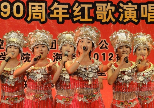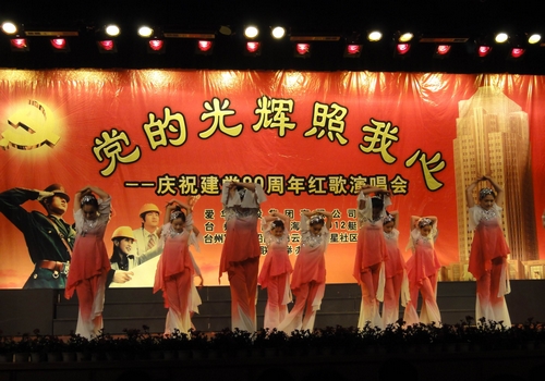 庆祝会后,举行了以“党的光辉照我心”为主题的红歌演唱会。由我校及爱华集团、海警33012艇、台州军分区船队、白云街道星星社区等选送的节目,可谓丰富多彩,有体现社区风情的腰鼓舞、有表现军旅特色的小组唱、有体现我校大学生艺术专业水平的群舞、表演唱、独唱等。