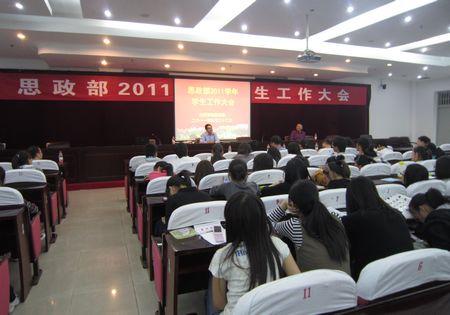 为统一思想,强化思政部学生的主人翁意识,9月22日晚,思政部在学术报告厅召开2011学年学生工作大会。思政部党总支书记杜才平出席并讲话,副主任林伟主持会议,辅导员、班主任及全体学生参加会议。
