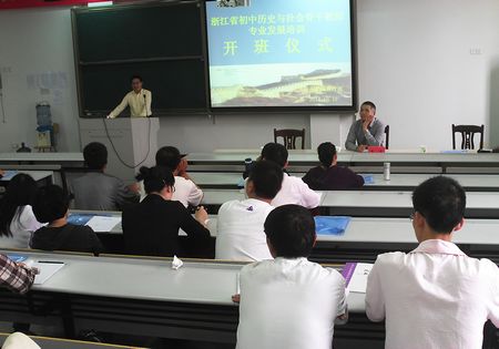 10月10日下午,校思政部主办的浙江省初中历史与社会骨干教师专业发展培举行开班典礼,思政部党总支书记杜才平致辞,部副主任林伟主持典礼。
