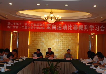 浙江省第十三届大学生运动会暨第十二届中学生运动会定向运动比赛将于10月15日在我校拉开序幕。13日晚,省大运会组委会在临海远洲国际大酒店举行定向运动比赛裁判学习会。赛事监督朱建清、总裁判长叶朝忠、赛事协调单小忠及各组裁判长裁判员出席会议。