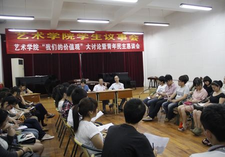 会议期间,学生代表们积极踊跃地发言,并代表班级同学提出了许多在校学习、工作、生活过程中遇到的问题,并对学院团学会工作提出了意见与建议。与会教师分别就专业学习、课程教学以及日常生活中遇到的问题,与青年学生进行交流,逐一解答同学们的问题。会上,代表们还围绕着“青春、奉献”主题开展了“我们的价值观”大讨论活动。