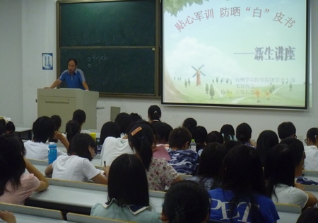 12日晚,由医学院女生部及美容协会共同举办的“贴心军训,防晒白皮书”讲座在2号楼303举行。医学院鲁继增老师为新生们讲解军训期间注意事项,如穿平底鞋、军服一天一洗等,尤其就如何防中暑及出现中暑反应后如何处理进行详细讲解。讲座还邀请护肤专家讲授护肤常识,教同学们如何正确护肤,以减少军训时的晒伤。讲座吸引了各专业的200多名大一新生参加。
