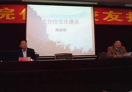 11月8日下午,天台县政协主席、著名校友陈政明应邀作客“三台人文论坛”,在临海校区学术报告厅为人文学院师生作“天台文化漫谈”专题讲座。人文学院院长郑友霄主持讲座。