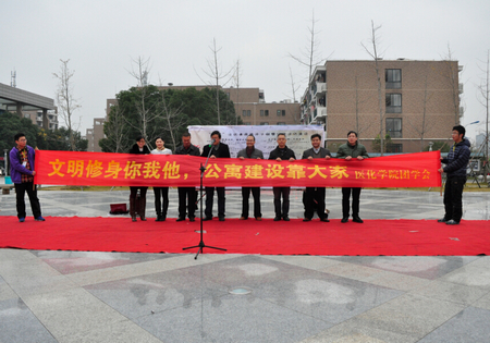 12月11日中午,医药化工学院首届“双笃”文化素质提升工程暨公寓文化建设活动启动仪式在椒江校区圆盘广场举行。学院党政领导韩得满、杨健国、蒋华江、吴高都出席,学院辅导员、团学会成员及全体14级学生参加。