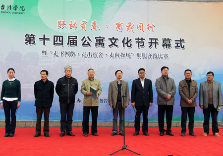 3月26日下午,我校第十四届公寓文化节开幕式暨“走下网络、走出宿舍、走向操场”绑腿齐跑比赛在临海校区田径场举行。校党委副书记冯尚申,副校长王正,党委委员、宣传部长牟惠康及相关职能部门负责人出席开幕式。