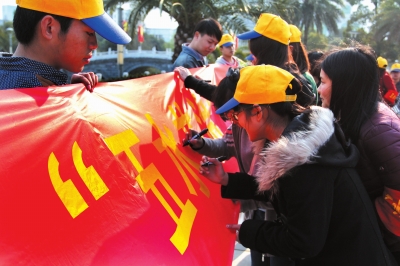 三月五日下午,大洋街道“青鸟”志愿者服务队、台州学院学生志愿者在市政广场举行“雷锋精神在我心、五水共治我先行”签名活动,得到了众多青年的响应。