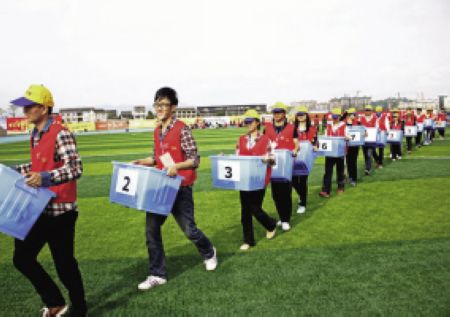 此外,为方便大运会开幕式晚会观众就座,该组志愿者为操场上近万把椅子都贴上了标签,并清理座椅,营造干净、整洁的就坐环境,工作量之大可想而知。对此,志愿者蓝东兰笑道:“作为志愿者,完成分内的工作是应该的,我们组织调度组是大运会的先头部队,第一关更要做好!”