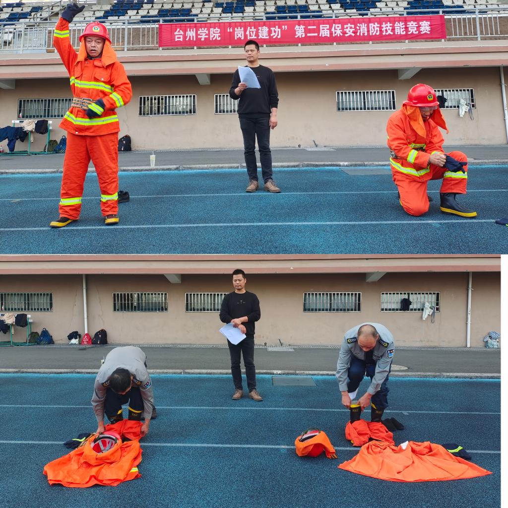 本次竞赛设有两盘水带连接、携两具灭火器50米跑、快速着消防服3个项目,椒江校区和临海校区各选派4名保安队员分别参加各个项目。两盘水带连接是整个消防技能竞赛中难度最大的项目,要求参赛队员穿戴好防火服、防火靴、防火头盔,检查好器材,携带好水枪,听到“开始”口令后,快速甩开第一盘水带,一端接上分水器接口,另一端接上第二盘水带,行至甩带线甩开第二盘水带,边跑边连接好水枪,快速冲到终点线。尽管操作步骤复杂,但参赛队员遇水带出线、压线或扭圈360度等状况时都能冷静处理、沉着应对。