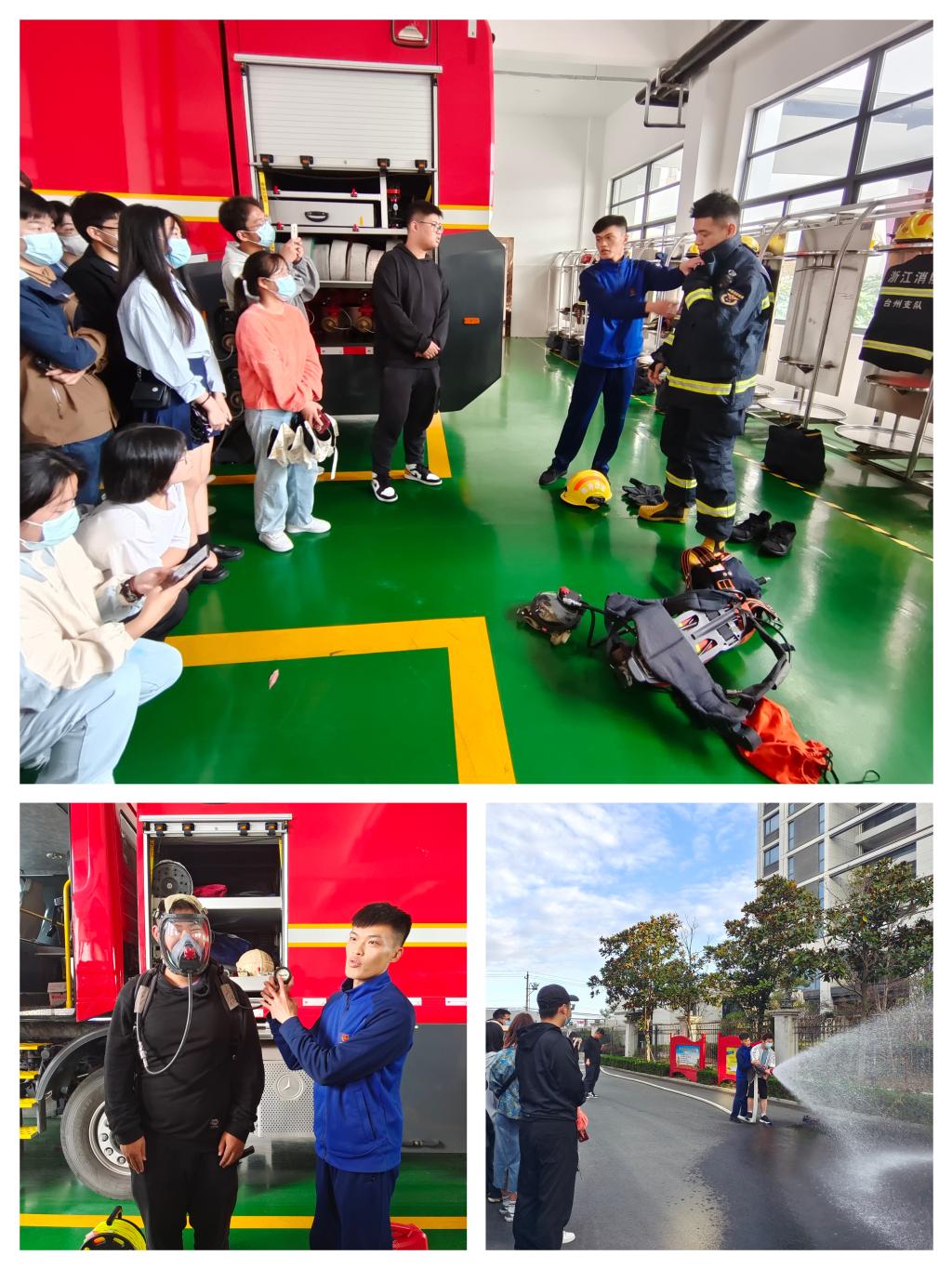 疏散逃生演练,模拟的是宿舍楼火灾逃生施救。宿舍楼中突发火灾,霎时楼道内浓烟四起,学生立刻报警并开始疏散逃生,他们用湿毛巾捂住口鼻,快速有序组织撤离。消防队接到火警后,迅速赶赴现场,开展火情扑救和伤员救护等工作;随后消防队员在三楼阳台架设伸缩拉梯,指挥被困同学攀援而下,逃生自救;最后消防车升起消防云梯,成功营救出被困于高楼层的同学。灭火演练中,在消防灭火指导员的专业指挥下,在场人员依照“提、 拔、握、压”的操作步骤,进行了标准有序的灭火动作学习演练。椒江校区部分师生代表还赴台州市公共安全教育馆和椒江区消防大队参观学习。