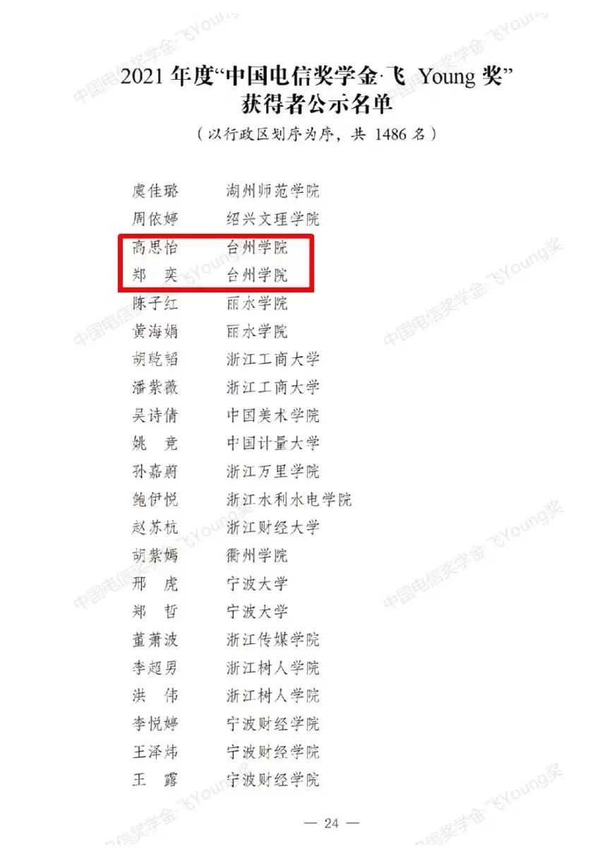 2021年度“中国电信奖学金”推报活动由共青团中央、全国学联指导,中国电信集团有限公司、中国光华科技基金会联合举办,分为“中国电信奖学金·天翼奖”和“中国电信奖学金·飞Young奖”,旨在遴选和推介一批优秀大学生典型,凝聚和引领当代大学生树立远大理想、热爱伟大祖国、担当时代责任、勇于砥砺奋斗、练就过硬本领、锤炼品德修为。经校级、地市级分别推荐、省级初评和全国评审,最终确定“中国电信奖学金·天翼奖”获得者98名,“中国电信奖学金·飞Young奖”获得者1486名。