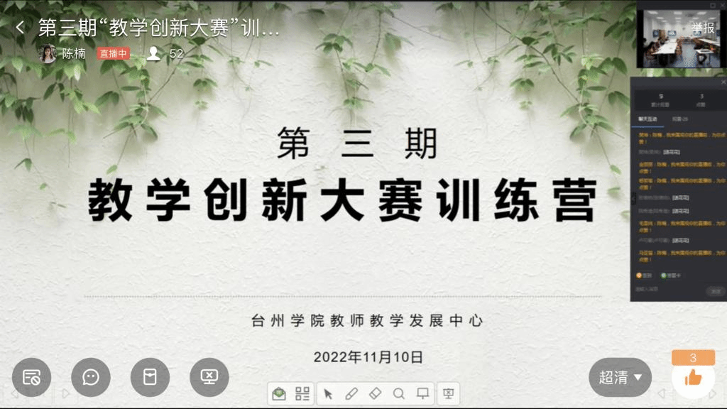 第三届全国高校教师教学创新大赛已经启动。为助力参赛教师掌握最新政策动向,积极备战参赛,11月10日下午,教师教学发展中心在椒江校区举办了第三期“教学创新大赛训练营”交流活动,五十余位教师线上线下共同参与。
