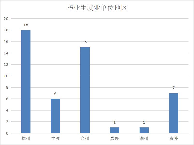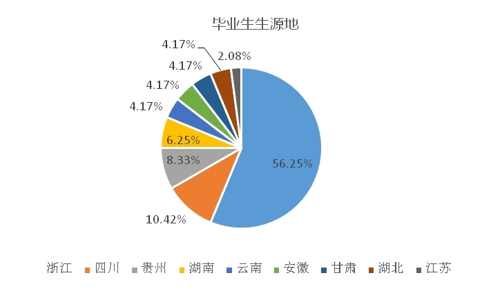 浙江省省内就业41人(含升学2人),省外就业7人(含升学5人)。毕业生留在浙江的比例为85.42%,其中留台比例为36.59%;省外比例为14.58%,其中71.43%为升学,即除了升学外,在省外就业的比例仅为4.17%。