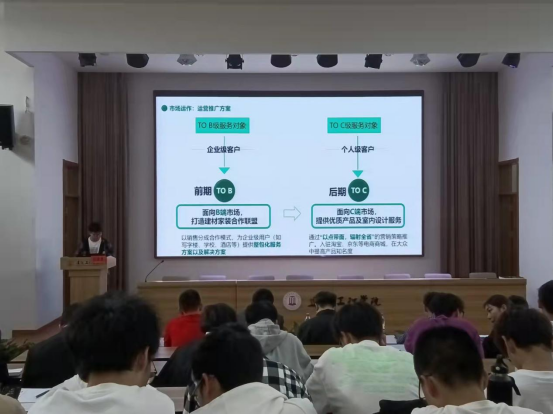 本届院赛共有47个项目、250余名同学自主参加,经学院创新创业委员会初评,23个项目进入会评环节。会上,各项目团队从项目背景、项目内容、市场分析、项目优势及创业风险等方面进行PPT汇报,项目内容涉及室内“绿化”、绿色建筑、垃圾分离、自主租赁、助农服务等多个领域。答辩环节,评委老师对各团队的创新想法给予肯定和鼓励,同时,老师们从项目前期调研、市场前景以及汇报需注意的问题等方面提出了指导性的意见。