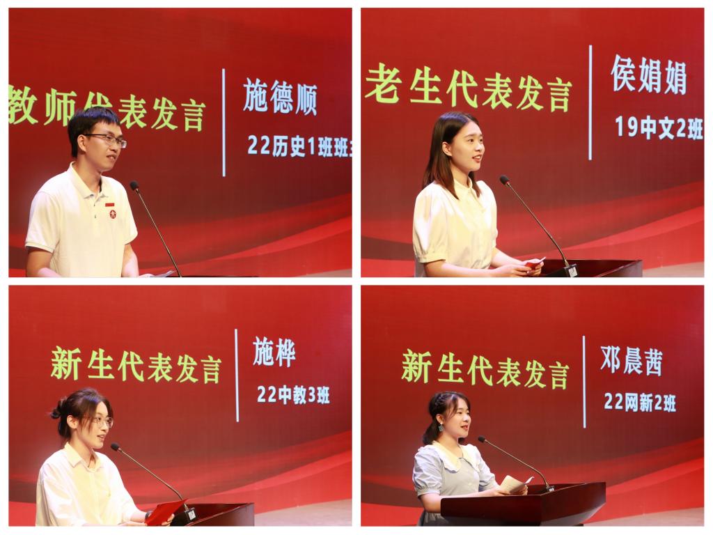 接着,教师代表施德顺发言,他鼓励同学们做好以下几点:认识你自己、坚持真理和善于思考、高尚地生活。老生代表侯娟娟则结合自身的经历,向大一新生们分享了她在大学三年里不断成长、不断进步的故事。施桦、邓晨茜两位同学分别作为新生代表发言,他们用真挚的言语,表达了自己逐梦前行的决心与毅力。