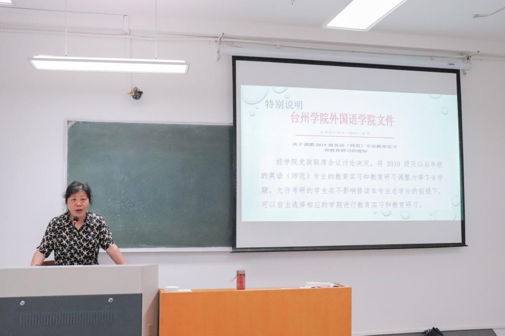 9月5日中午,外国语学院在临海校区2201教室举办2019级英语教育实习动员大会。本次大会由外国语学院英语师范系主任李彬彬主讲,学院实习指导老师及19级英语教育学生参会。