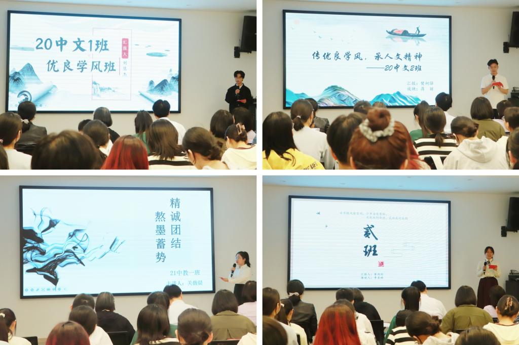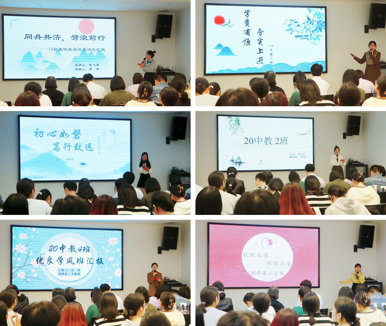 本次活动以“同德一心,笃学致知”为主题,进行班级风貌展示。十个参赛班级的主讲人通过PPT演示和口述讲解的方式,从班级概况、学风建设、活动荣誉及素质拓展等方面总结过去,展望未来,全方面展现班级综合实力和班级风采。各班级都向着明确的目标踔厉奋发,在浓厚的学习氛围中共同进步。随后,2020学年校特优学风班19中教三台班对他们的班级进行风采展示,给大家分享他们的班级管理方法与经验,体现榜样示范引领作用。