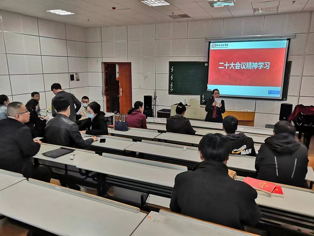 11月17日下午,艺术与设计学院师范专业教工党支部在艺术楼S102教室举行党的二十大精神学习会,支部书记陈乾英进行主题宣讲。