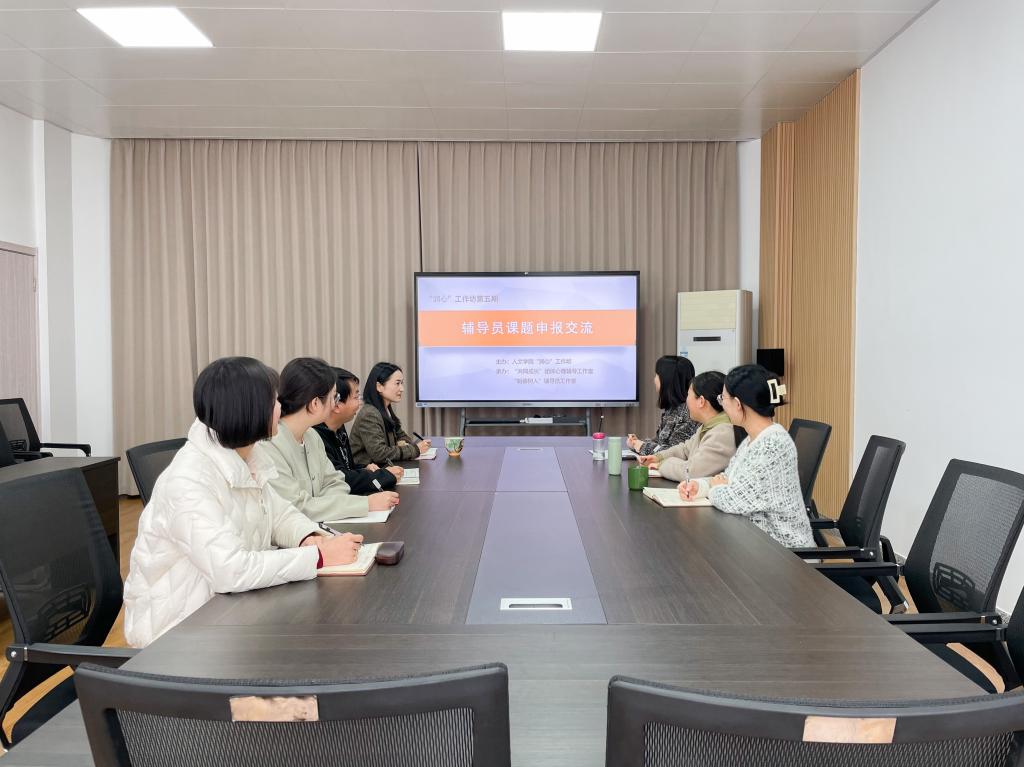 3月16日上午,人文学院举办“润心”工作坊第五期——辅导员课题申报交流会。本次会议由“润心”工作坊主办,“共同成长”团体心理辅导工作室、“明德树人”辅导员工作室承办。会议由院党委副书记林仙主持,辅导员高晗雯主讲,学工办全体辅导员参会。