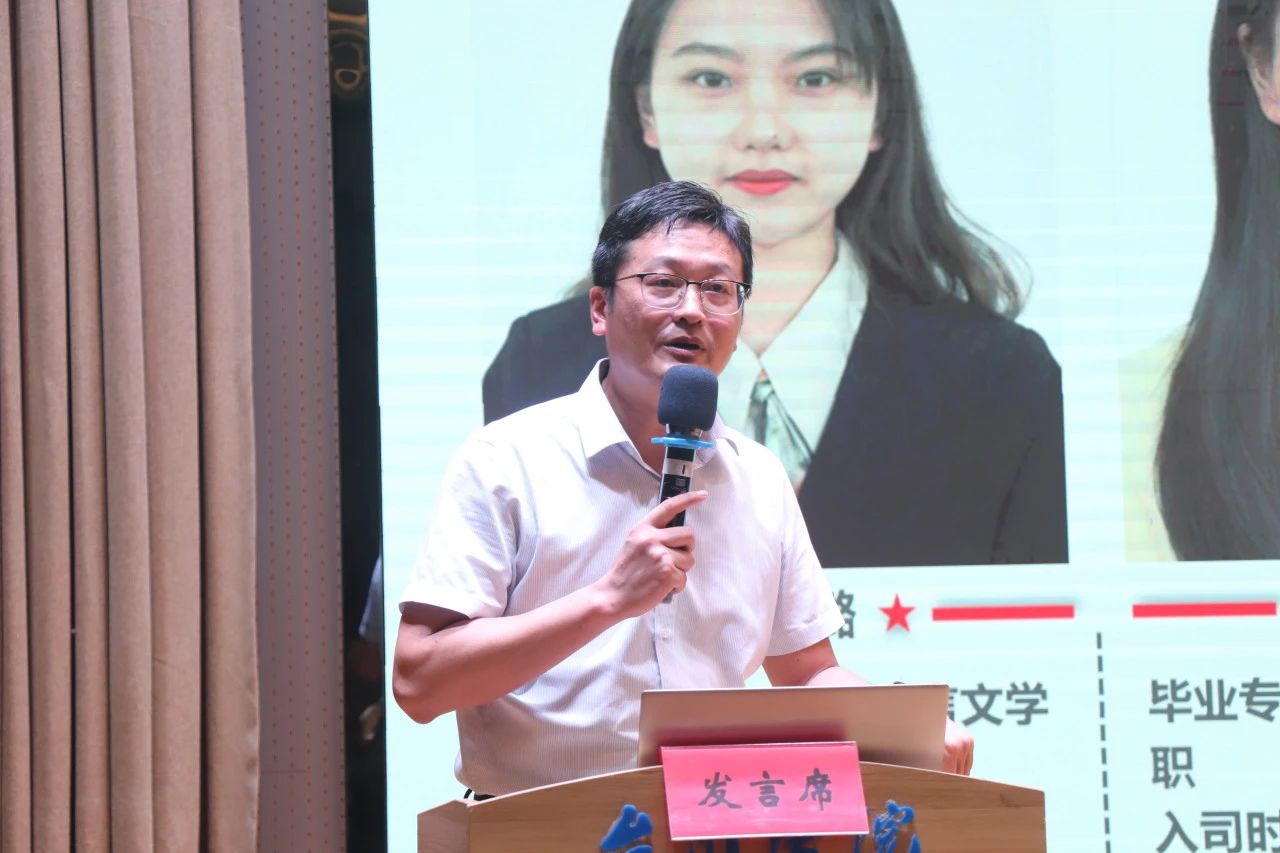 公元股份有限公司人力资源总监林燕春,现兼任23国贸1、2班企业班主任。他介绍了公元股份有限公司的用人理念:“以品德定取舍、以能力定岗位、以贡献定薪酬”,并展示了优秀校友在公司获得的成就。