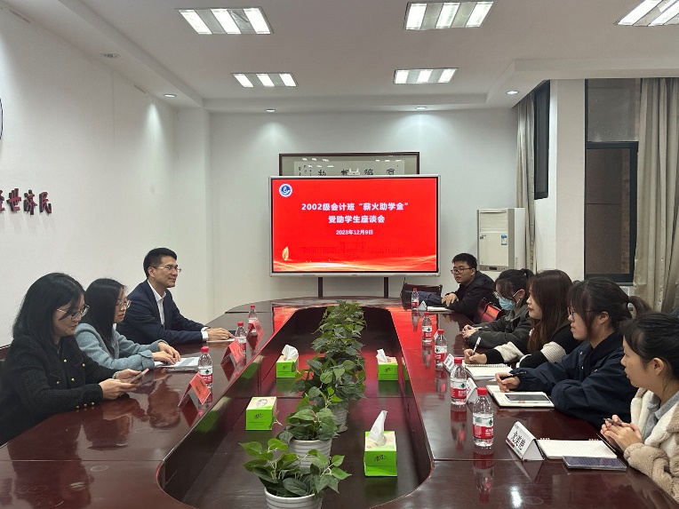 12月9日下午,商学院在201会议室举行02会计班“薪火助学金”受助学生座谈会。商学院02会计专业校友冯贻昌、陈笑,院党委副书记陈斌岚,辅导员和助学金获得者参加此次活动。