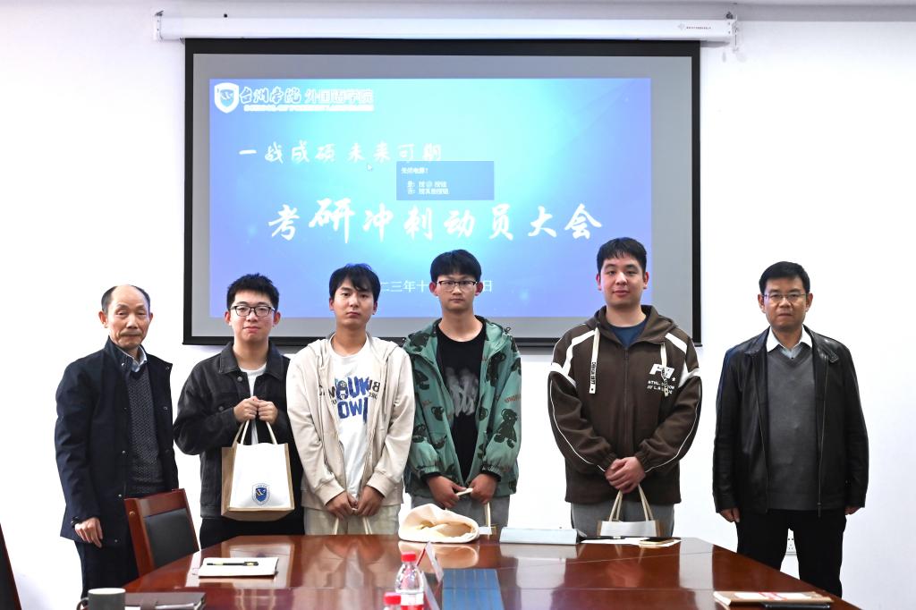 为进一步提高学生的考研积极性,外国语学院于12月11日在4101会议室举行考研冲刺动员大会。院长王刚、院党委书记李涛出席,院党委副书记鲁建波主持,辅导员、2024届考研学子参加。