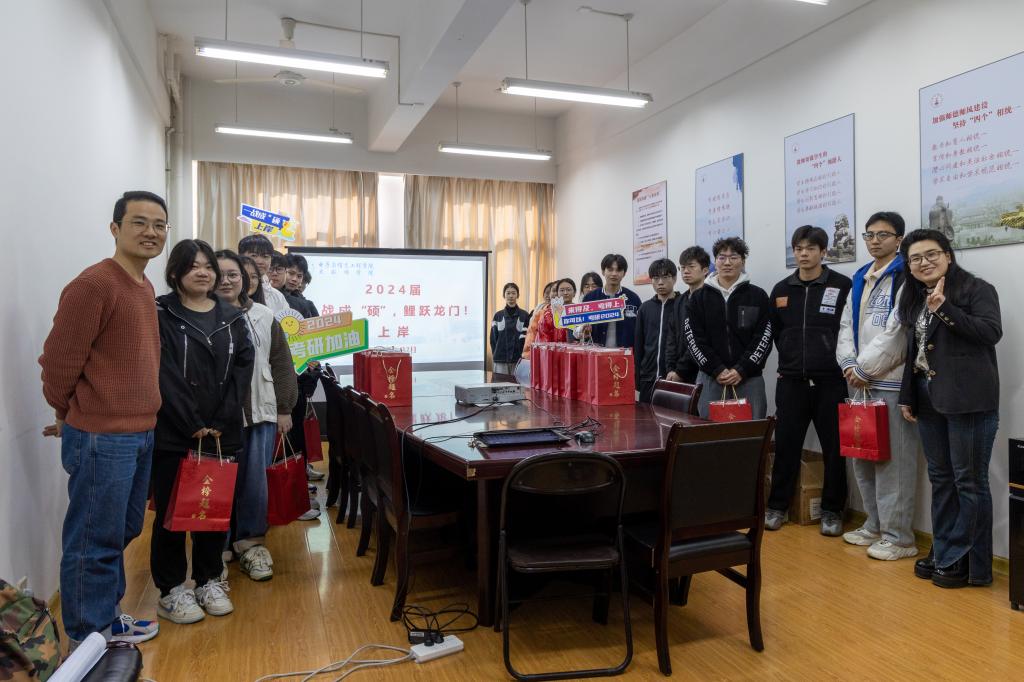 随后,老师们为大家发放学院为同学们精心准备的考研礼包,体现了电信学院全体领导、老师对学子们的热诚关怀和殷切期待,希望能让身处紧张备考氛围中的同学们感受到来自学院的关爱和温暖。收到礼物的同学纷纷表示感谢,表态会积极认真备考,全力以赴,不辜负自己的辛勤付出,也不辜负学院以及老师们的殷切期望。
