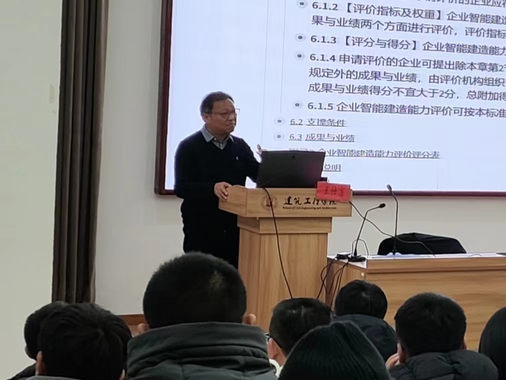 本次培训在我校建工学院学术报告厅举行,邀请中国工程建设标准化协会智能建造专委会常务委员、浙江省工程建设质量管理协会副秘书长、浙江省建筑业现代化台州产业学院执行院长王仕方教授,以及浙江省土木建筑学会工程管理学术委员会委员、建工学院土木系主任肖磊副教授,分别作《智能建造实践与探索》《智能建造初级阶段企业转型路径思考——基于示范项目评审视角》报告。