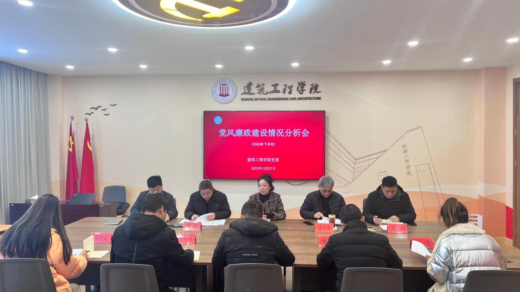 为深入开展学习贯彻习近平新时代中国特色社会主义思想主题教育,进一步深化“清廉建工”建设,巩固发展良好政治生态, 12月27日上午,建筑工程学院党委召开2023年下半年党风廉政建设情况分析会。学院班子成员、党委委员及支部书记参加会议,院党委书记潘瑛主持会议。