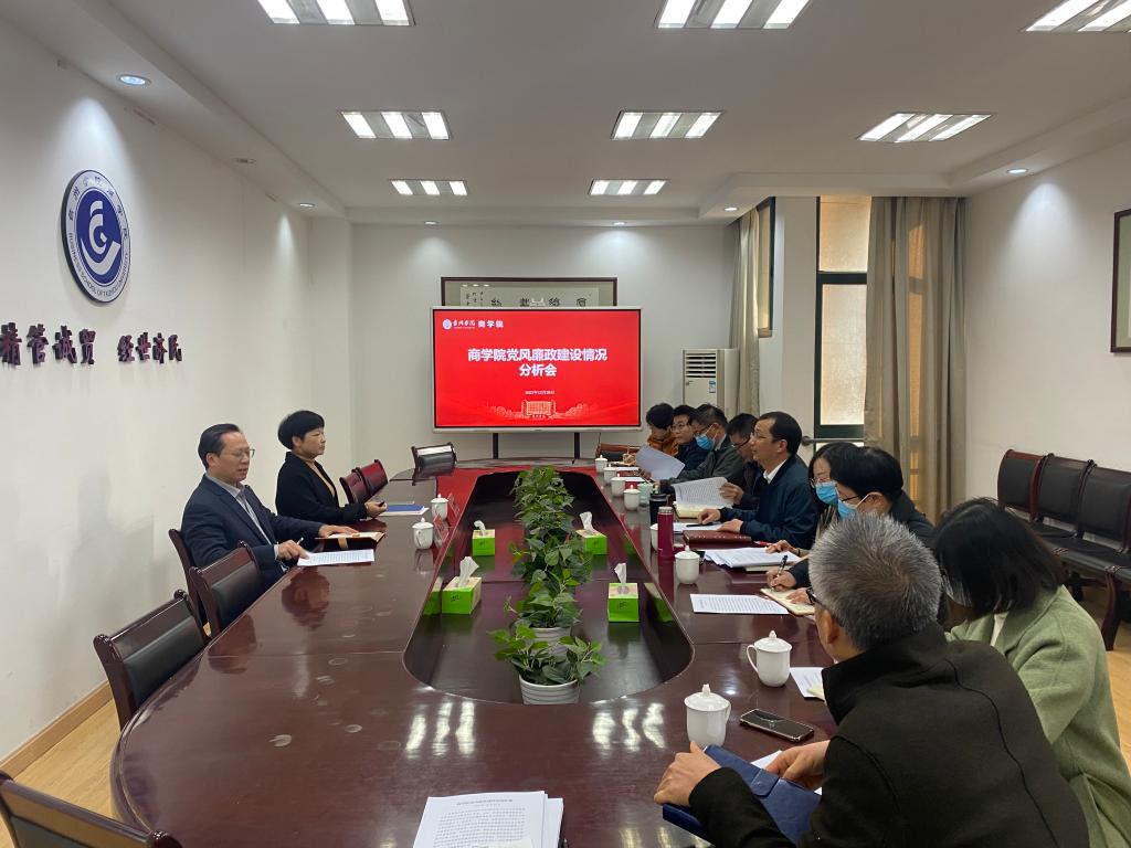 为深入学习贯彻党的二十大精神和全面从严治党战略方针,深化“清廉校园”建设,巩固发展良好政治生态,12月29日上午,商学院召开2023年下半年党风廉政建设情况分析会。校党委副书记潘通天、纪委委员张梅芬出席会议并作指导,学院全体党政班子成员、党委委员、纪委委员、教工党支部书记参加会议,会议由院党委书记马斌主持。