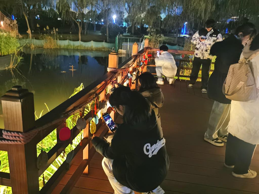 在“点亮希望”环节,同学们在彩色的心愿牌上写上自己的新年愿望,并一同前往学校“心湖”的“心愿桥上”,挂上自己亲手书写的心愿牌。