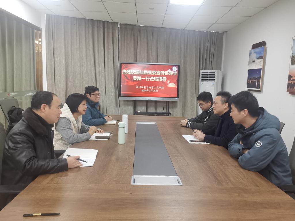 1月26日下午,仙居县委宣传部常务副部长吴凯一行三人来到马克思主义学院洽谈合作,院长张天华、副院长李跃华、党总支副书记徐培林,以及部分教师代表参加交流洽谈。